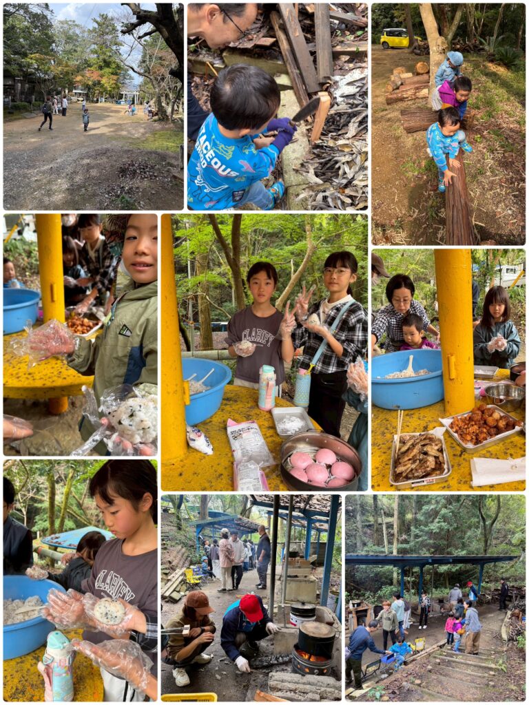 11月2日(日) 第32回こども食堂開催いたしました。 メニューは、手羽先の塩焼き.ポテトフライ.揚げたこ焼き.こども達が握ったおにぎり、徳島こども食堂ネットワークさんからいただいた。タコの唐揚げ.台湾蜜芋まんです。 前日の雨で少し湿っていますが木をこども達が、集めて来てくれました。(火はつくまでは苦労しました😥) 調理は、中校生と引率のお母さんお父さんがこども達を見守りながら怪我なくできました。最近は近所のご高齢の方たちが食事の後に昔の遊びなどを教えてくれてます。 多世代の交流の場になって来てます。こども25名、おとな35名、スタッフ10名(中高生含む)でした。