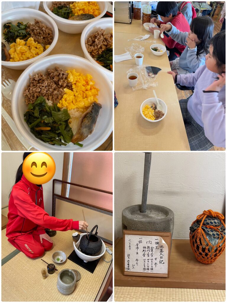 メニューはそぼろ、卵そぼろ、ネットワークから頂いたアジの塩焼き、わさび菜のおひたし、を使った丼と蜜いもまん でした