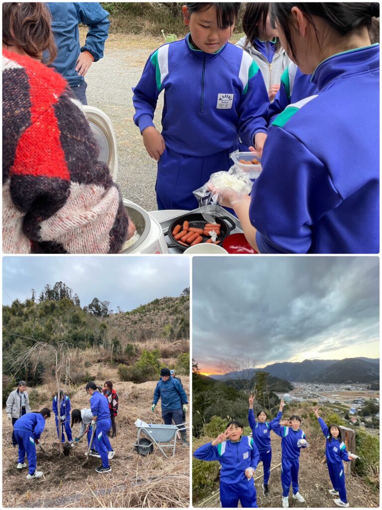 前の山の遊び場や基地作り、植樹などをしています。おにぎりを作って、オヤツも持って、山を駆け上がり、天辺で夕陽とロープウェイを見ながら、最高😀と叫びながら食べました。
