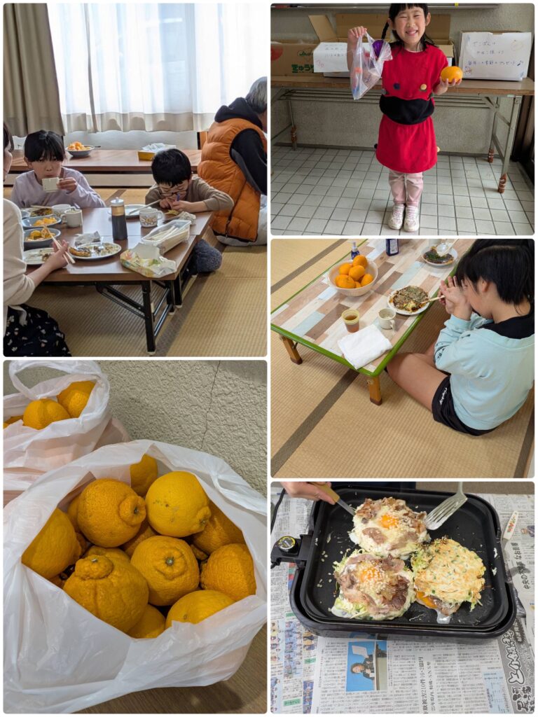 今回はお好み焼きと、みかんやデコポン、さつまいもチップスを提供しました