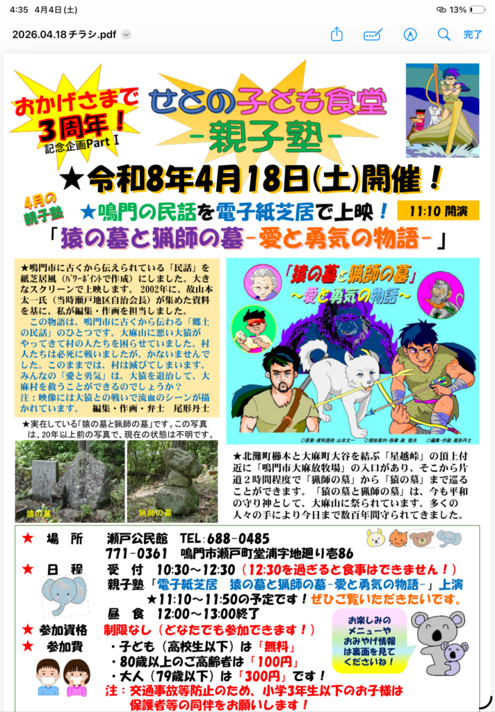 みなさんこんにちは!せとの子ども食堂ー親子塾ー 会長 尾形丹士です。 おかげさまで4月の開催で4年目に突入です。3周年記念企画として、電子紙芝居「猿の墓と猟師の墓~愛と勇気の物語~」を上演します。20年余り前に作成したものです。わずかな資料を基に私が編集・作画を担当したものです。大きなスクリーンに投影し、弁士は私が担当します。・・・と、いうような分けで、今回に限りチラシを添付させていただきます。 興味のある方はぜひお運びいただけたらうれしいです。 4年目もスタッフみんなで力を合わせて頑張ります。ご支援をよろしくお願いいたします。